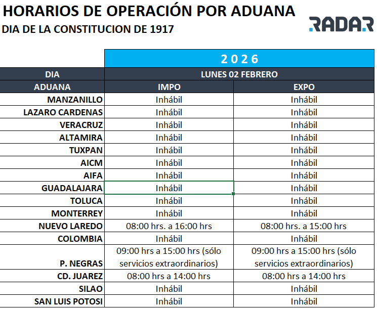 Flash Informativo 27.01.2026 -“OFICINA:TODAS-HORARIOS DE OPERACIÓN ADUANAS 02 DE FEBRERO 2026” enero 27, 2026 Estimado Cliente RADAR, Por este medio, les informamos la forma de laborar de las aduanas para el 03 de febrero de 2025, siendo este un día inhábil para RADAR. Sin otro en particular, reciban un cordial saludo. Entrada anterior BOLETÍN LEGAL 27.01.2026